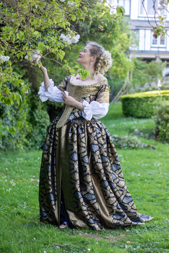 Rebekah is wearing View C with a shortened train in Size 42. Her Anne is made of silk satin with supplementary lamé weft brocading.