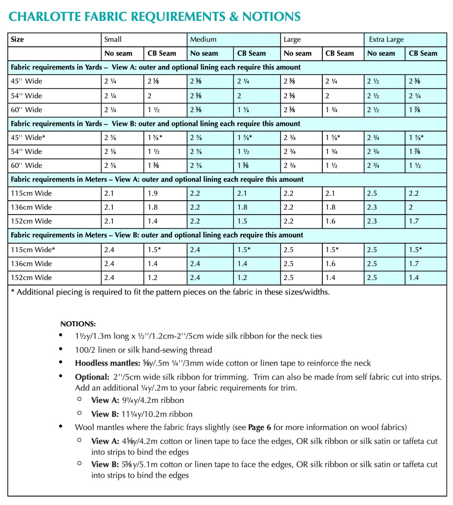 Outer Fabric: silk taffeta and satin, figured silks. Midweight fulled wools. Sheer silks, sheer linens and sheer cottons including embroidered muslin for unlined versions. Printed cottons for lined versions.