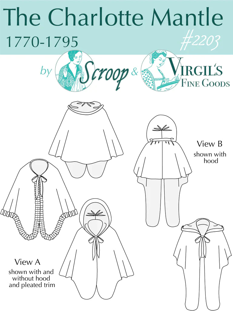 Like all Scroop + Virgil's Fine Goods patterns the Charlotte Mantle pattern includes detailed user-friendly instructions on making the mantle using historical techniques, as well as extensive additional historical information about the fabrics, notions and techniques used.